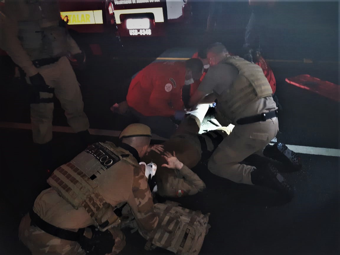 Com o impacto, o policial chegou a quebrar o para-brisa do veículo. A vítima foi socorrida por policiais militares e bombeiros voluntários. O PM sofreu uma fratura na perna esquerda e escoriações pelo corpo. Depois dos primeiros socorros, ele foi levado para o hospital.
