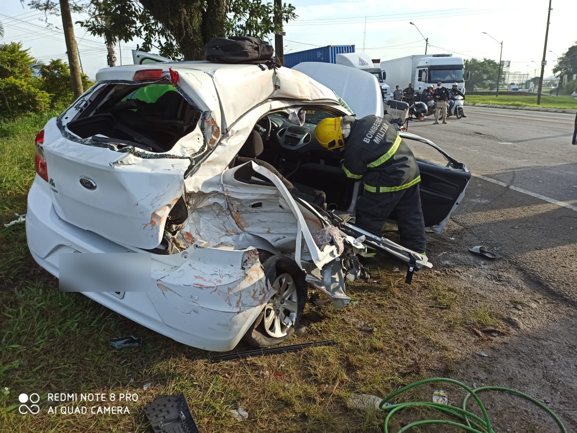 O Corpo de Bombeiros Militar e o Samu (Serviço de Atendimento Móvel de Urgência) foram chamados para atender a batida entre um caminhão e um carro na manhã desta terça-feira (11), nas proximidades do trevo da BR-101.