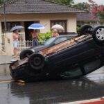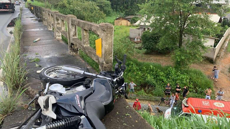 Casal caiu do viaduto após a moto colidir na mureta de proteção. Ainda não há informações sobre como teria ocorrido o acidente. Há marcas de frenagem na pista. Bombeiros e SAMU foram acionados e seguem no atendimento às vítimas.