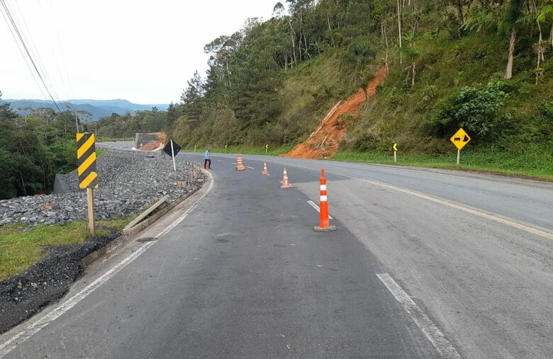 - km 84 (Corupá): Pista reduzida para suporte às obras emergenciais