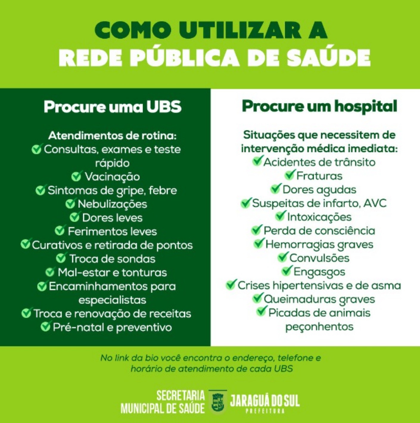 A Prefeitura de Jaraguá do Sul, por meio da Secretaria de Saúde, orienta os munícipes a buscarem atendimento nas unidades básicas (UBS), que estão com horário especial desde o dia 26 de dezembro de 2023 (ver locais e horários abaixo). Os postos de saúde com este esquema estão localizadas em pontos estratégicos do município, com o objetivo de facilitar o acesso à população.