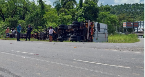 Na tarde desta terça-feira (16), por volta das 15h20, uma carreta carregada com bobinas de papel tombou e caiu em um barranco após uma colisão com um carro na BR-280, no bairro Caixa d’Água, em Guaramirim.