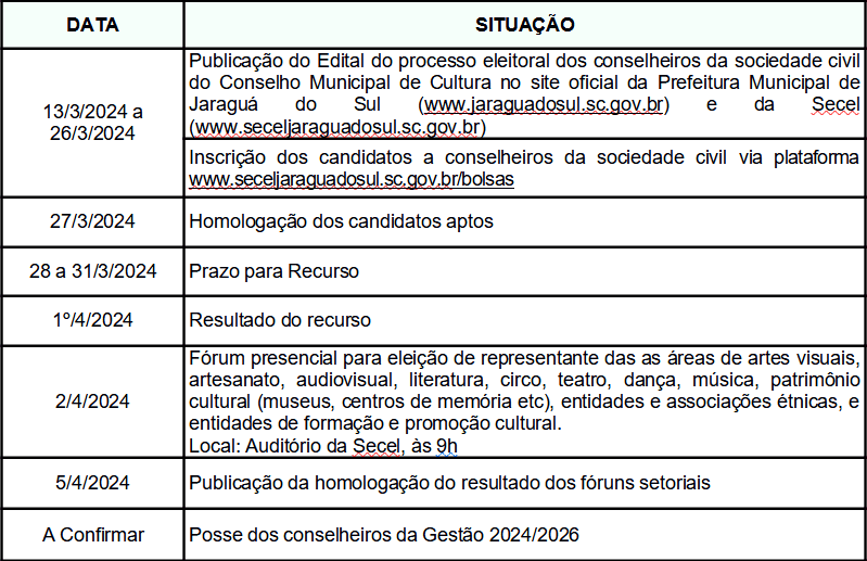 Serão eleitos cinco representantes titulares e os respectivos suplentes da classe artística e cultural vinculados às áreas de artes visuais, artesanato, audiovisual, literatura, circo, teatro, dança, música, patrimônio cultural (museus, centros de memória), entidades e associações étnicas e entidades de formação e promoção cultural, além de um titular e seu respectivo suplente vinculado aos Clubes e Sociedades de Tiro de Jaraguá do Sul.