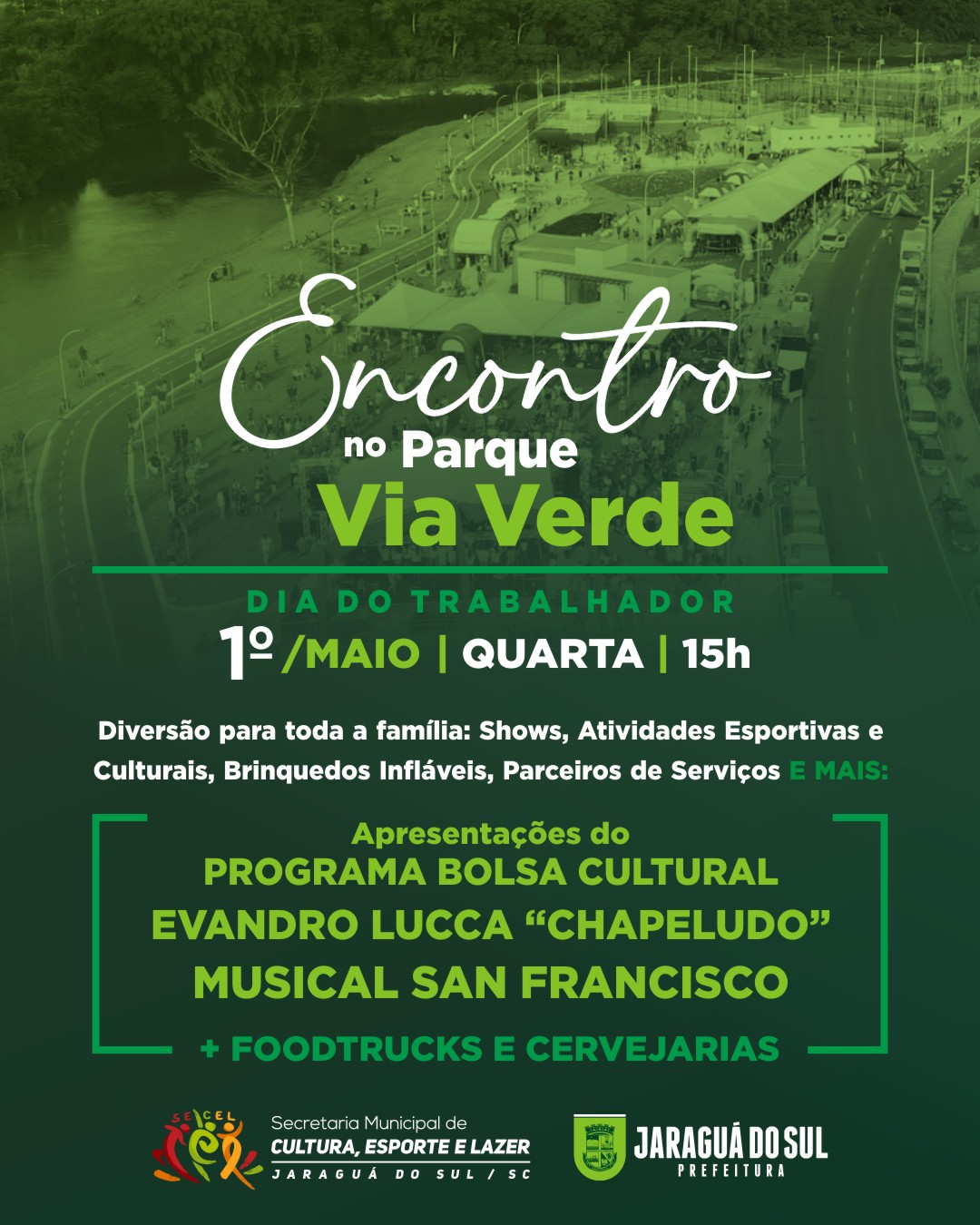 A Prefeitura de Jaraguá do Sul, por meio da Secretaria de Cultura, Esporte e Lazer, lembra que nesta quarta-feira (1º), para marcar o Dia do Trabalhador, ocorrerá o Encontro no Parque Via Verde, na Ilha da Figueira. A programação, a partir das 15h, terá várias atrações para proporcionar momentos de lazer, entretenimento e diversão para toda a comunidade.