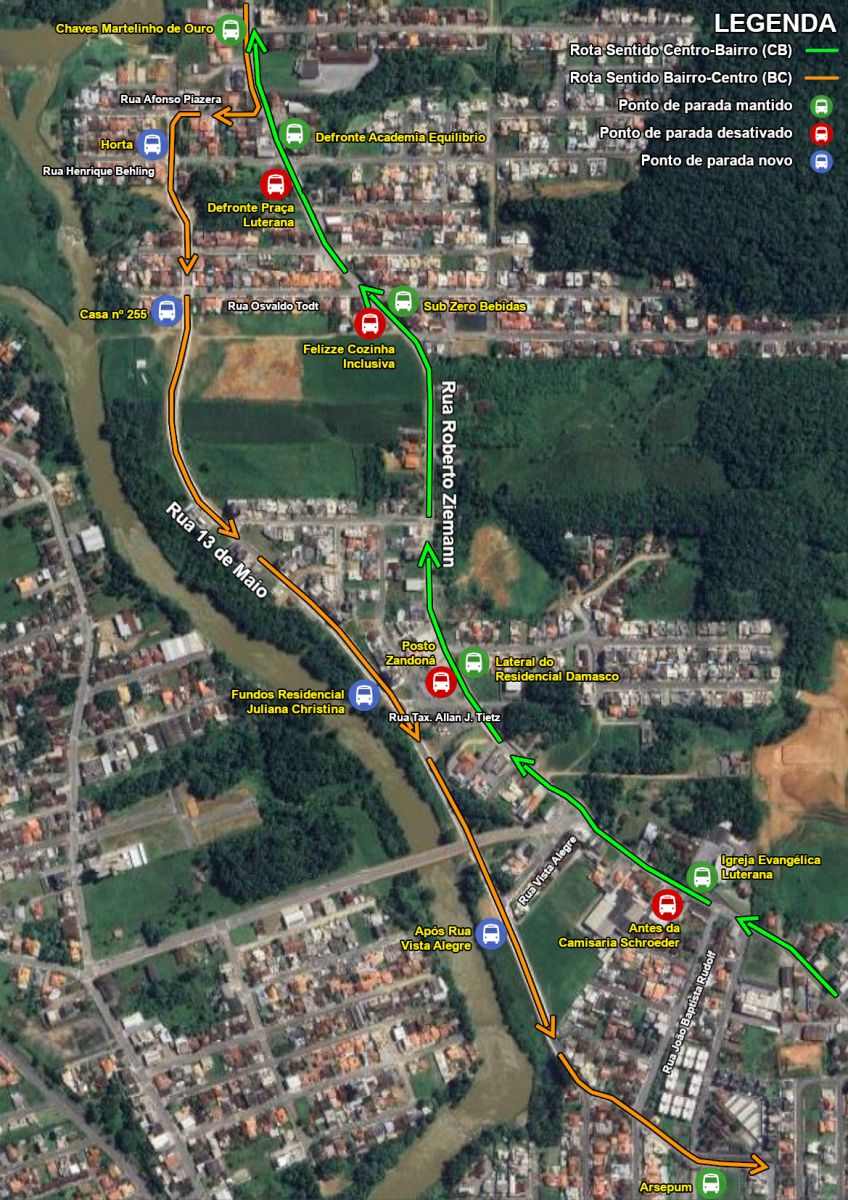 Em virtude dessas alterações, quatro pontos de paradas serão instalados na 13 de Maio, enquanto outros quatro pontos de parada serão desativados na Rua Roberto Ziemann (sentido bairro/Centro). Nesses locais, haverá avisos sobre a mudança e o novo ponto de parada.