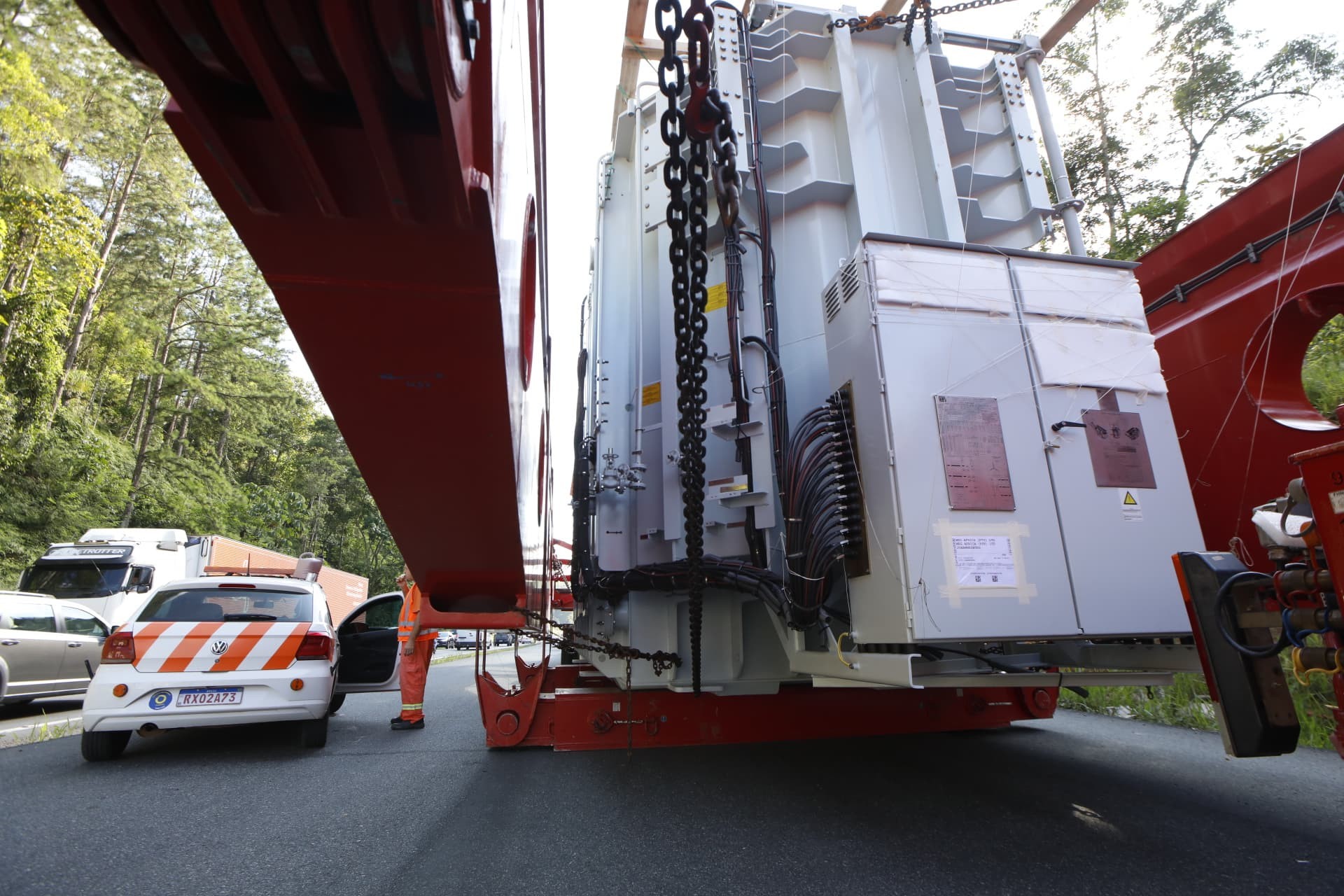 Veículo transporta um autotransformador trifásico da multinacional WEG e saiu de Blumenau com destino ao Porto de Itajaí, trajeto de cerca de 50 quilômetros. Supercarreta de 80 metros e 450 toneladas causa lentidão na BR-470