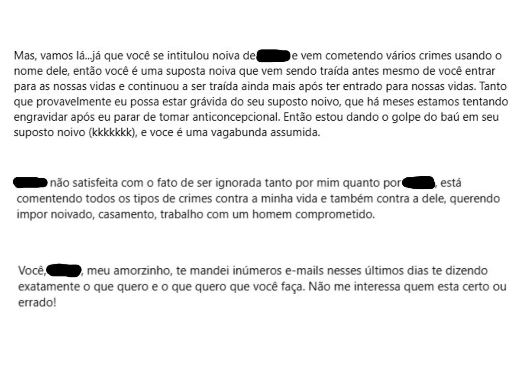 Extensa, a narrativa ainda tem ameaças: “Quero essa vadia longe de mim de todas as formas, porque de duas uma, ou ela vai presa ou vai para o hospital”.