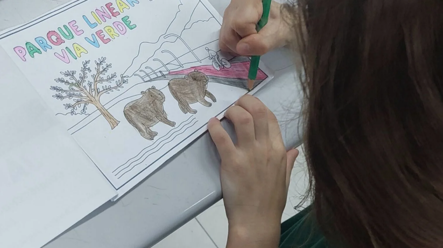 Durante as aulas, além de colorirem os desenhos, os alunos assistiram a vídeos educativos, realizaram leituras e debateram sobre as diferentes utilidades e formas de uso desses espaços públicos, reconhecendo a importância de cada um para o lazer, a cultura e a socialização.